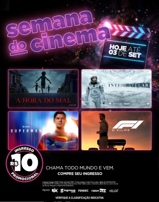 Entre os destaques da programação estão F1® O Filme, produção eletrizante que leva a adrenalina das pistas para a tela grande; Superman, o épico que conquistou milhões de fãs ao redor do mundo; o terror A Hora do Mal, repleto de suspense e mistério; além do aclamado clássico moderno Interstellar, que retorna às salas para emocionar novamente o público.